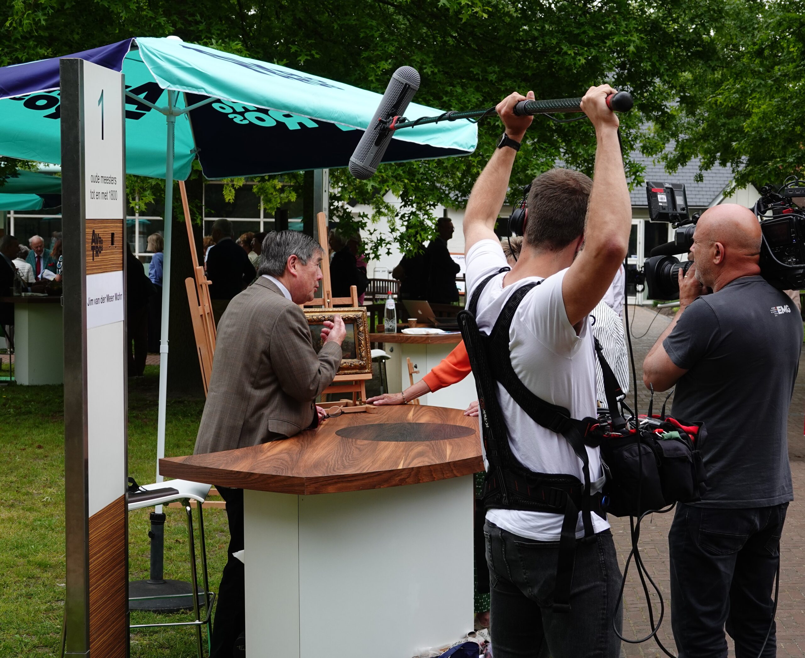Uitleg van een schilderij tijdens een opname voor Tussen Kunst & Kitsch in het Klok & Peelmuseum in Asten, 22 mei 2023.